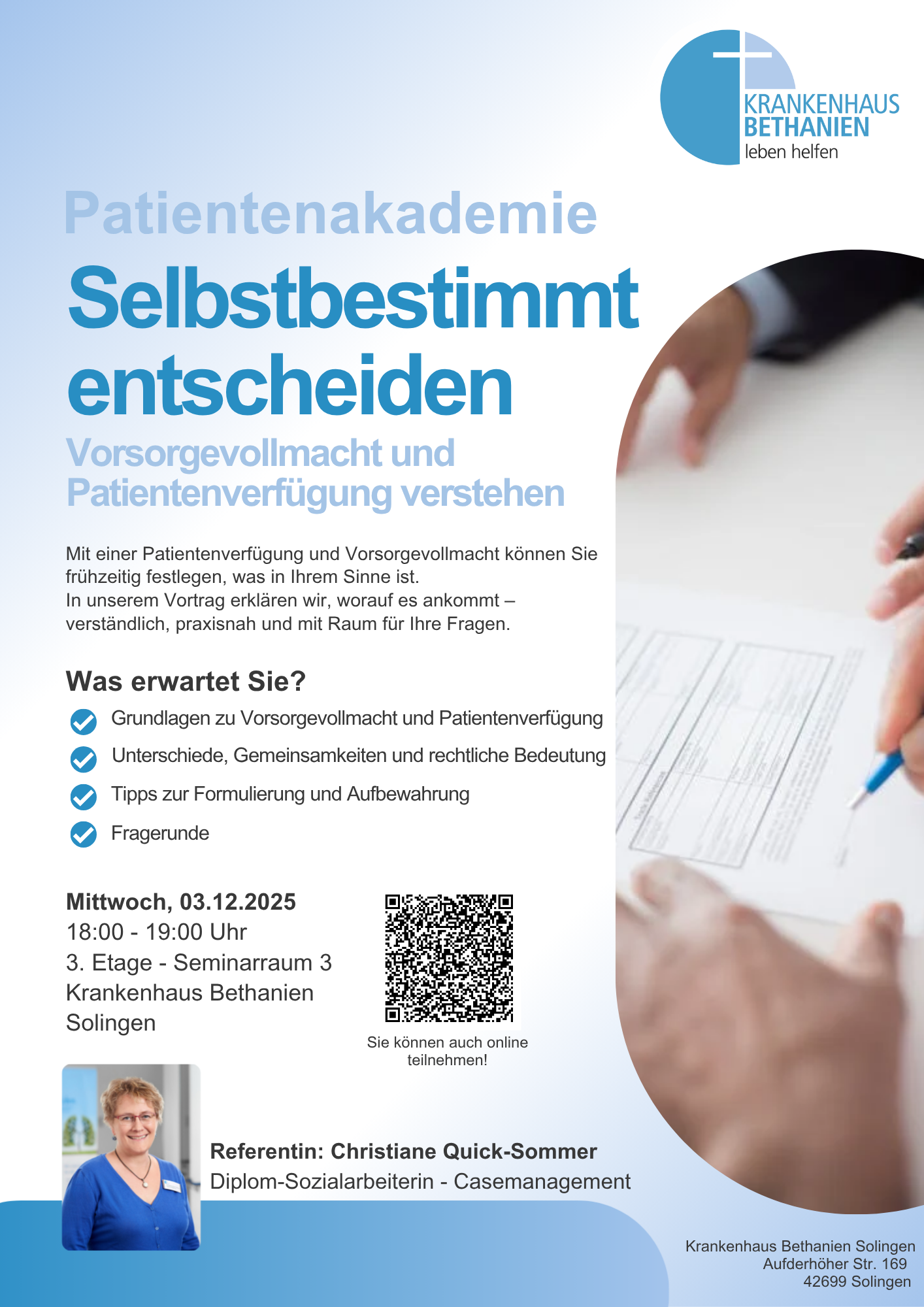 Wissen schafft Gesundheit! In unserer Patientenakademie bieten wir regelmäßig spannende Vorträge und Workshops rund um medizinische Themen an. Erfahren Sie mehr über Prävention, Therapie und aktuelle Entwicklungen, verständlich und praxisnah. Patientinnen und Patienten, Angehörige, Pflegende sowie alle Interessierten sind herzlich eingeladen, mehr über die Lungengesundheit zu erfahren. Im Anschluss haben Sie die Möglichkeit, Fragen zu stellen und sich mit anderen auszutauschen.