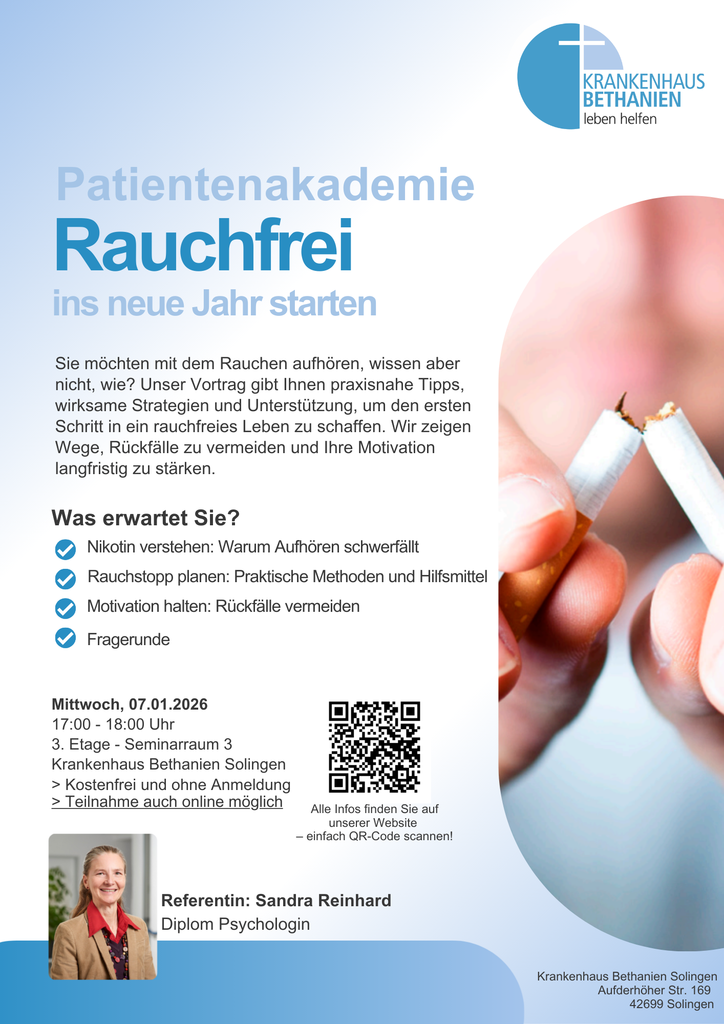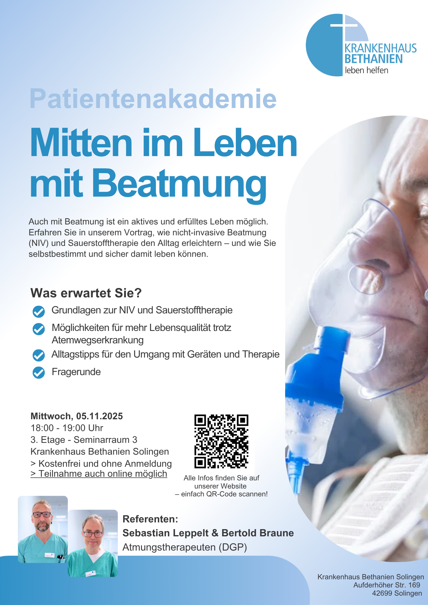 Wissen schafft Gesundheit! In unserer Patientenakademie bieten wir regelmäßig spannende Vorträge und Workshops rund um medizinische Themen an. Erfahren Sie mehr über Prävention, Therapie und aktuelle Entwicklungen, verständlich und praxisnah. Patientinnen und Patienten, Angehörige, Pflegende sowie alle Interessierten sind herzlich eingeladen, mehr über die Lungengesundheit zu erfahren. Im Anschluss haben Sie die Möglichkeit, Fragen zu stellen und sich mit anderen auszutauschen.